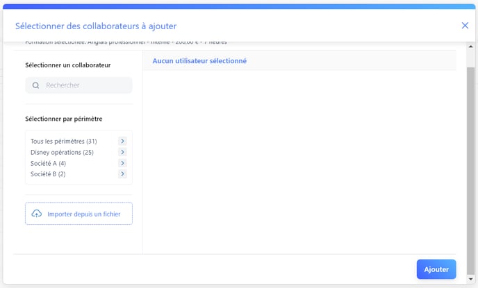 In the Training > Needs Collection section of your Manager Space, click on the yellow button at the top right of the screen "+ Add a line to the collection". After specifying the training by selecting it from the Skillup catalog or your own created programs, or by manually entering the associated information, you can select the employees to associate with this request.