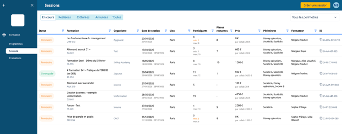 Vous y voyez les sessions qui vous ont été partagées ou sur lesquelles vous êtes renseigné comme formateur interne.