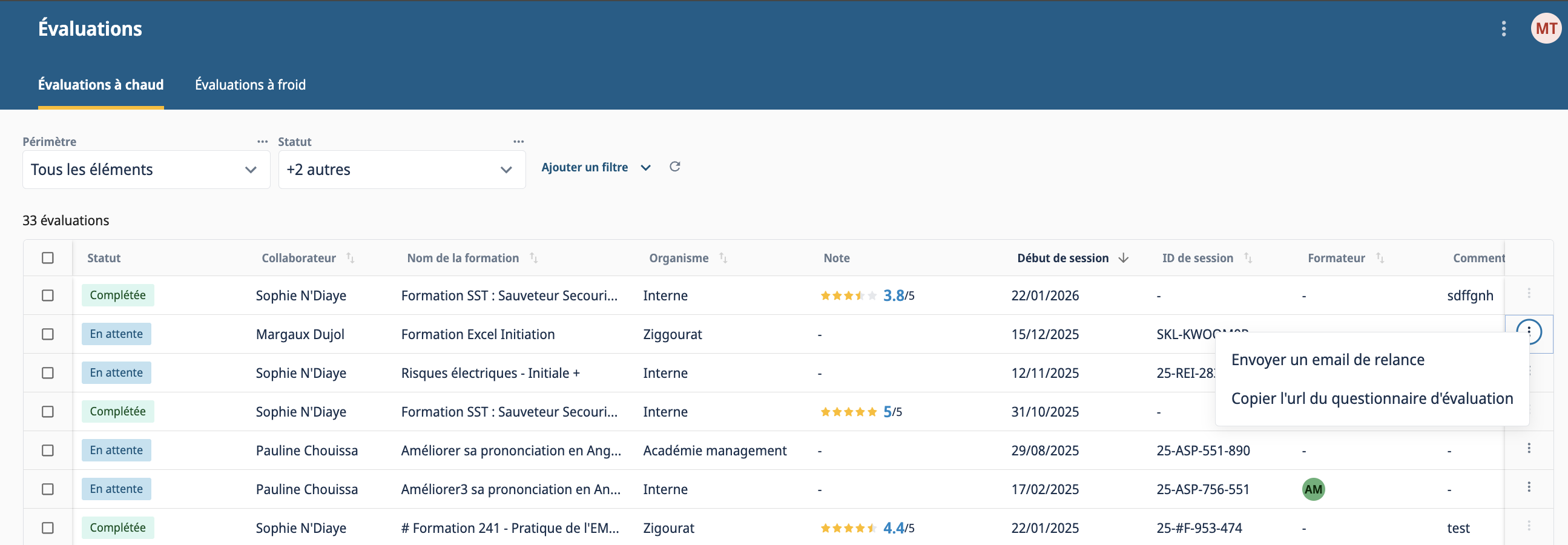 Les évaluations permettent de recueillir les retours des participants à l'issue d'une session.