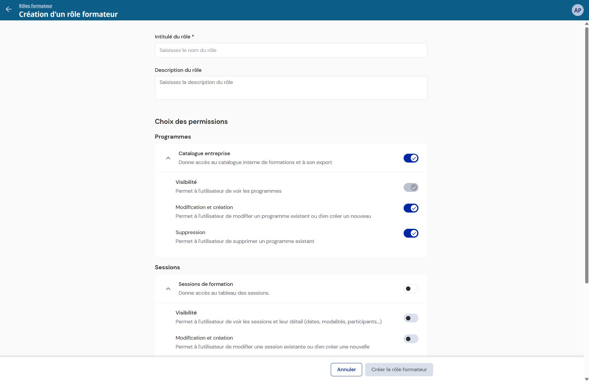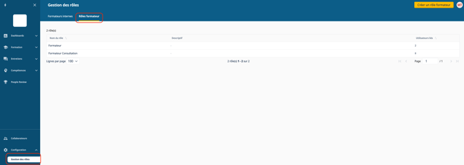 Il est possible de créer de plusieurs rôles pour une même entreprise avec des droits différents. L’affectation d’un rôle aux formateurs internes se fait via la pageConfiguration > Gestion des rôles > Onglet Formateurs internes
