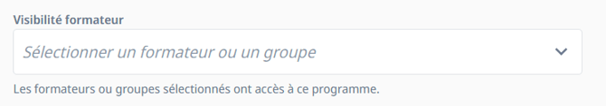 A la création d’un programme par un formateur interne, le programme lui est rattaché A la création ou à la modification d’un programme, vous pouvez en tant qu’administrateur RH choisir un ou plusieurs formateur(s) ayant la visibilité sur ce programme via le champ Visibilité formateur → Un programme est visible par un formateur interne si le champ Visibilité formateur contient son nom |