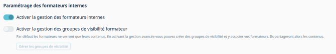- Activer les groupes de visibilité formateur — permet de regrouper des formateurs pour leur donner accès à des programmes, sessions et évaluations communs
