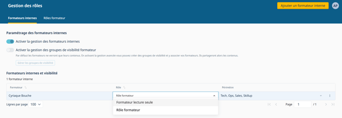 Rendez-vous dans Configuration > Gestion des rôles > onglet Formateurs internes pour :