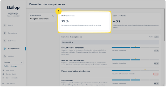 En haut de votre profil de compétences, deux chiffres clés vous donnent une vue d’ensemble :