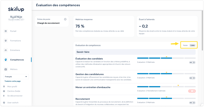 Vous pouvez passer d’une vue à l’autre :- Radar : représentation visuelle de vos forces et axes de progression.