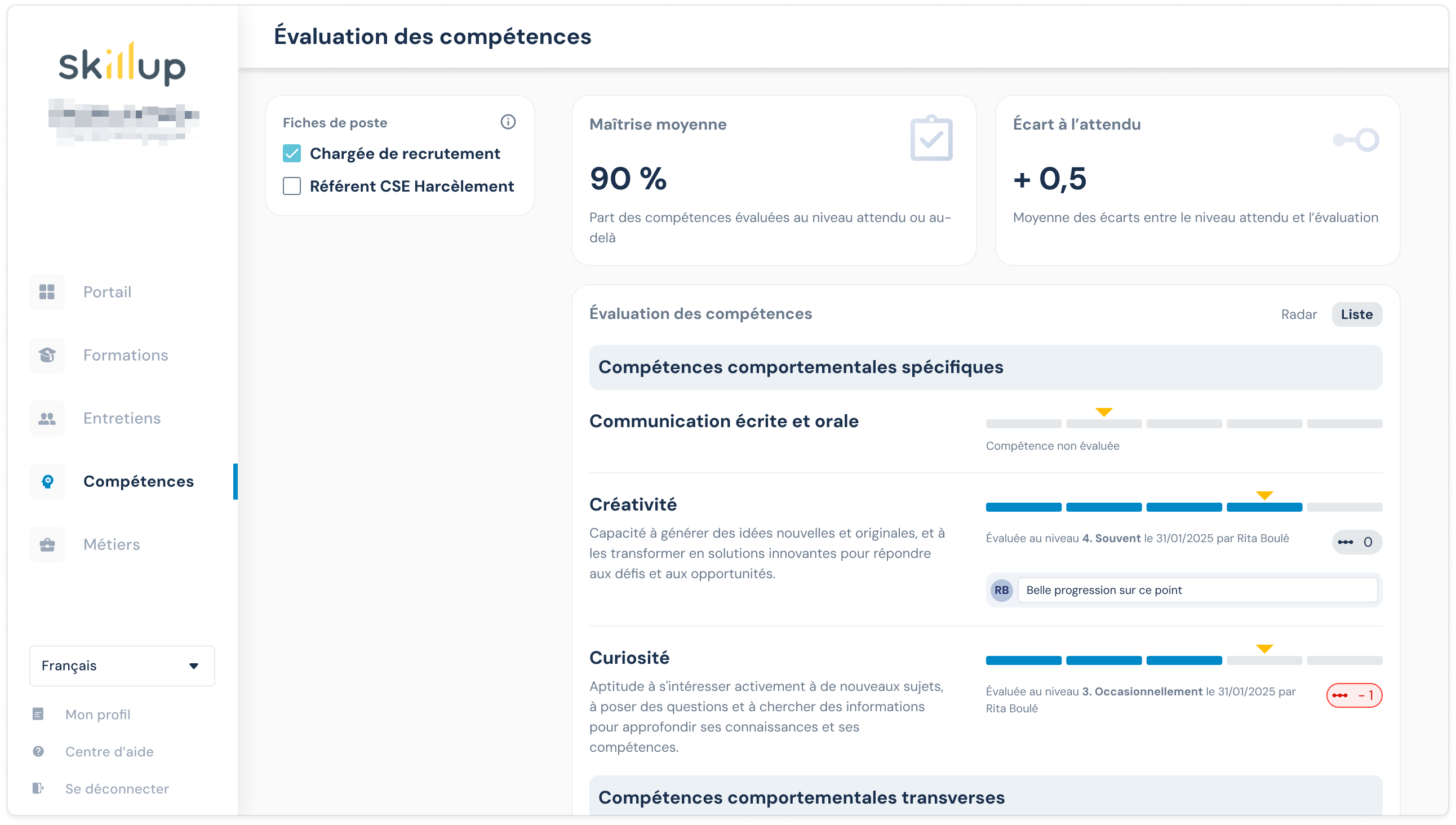 - La source de l’évaluation : date, niveau attribué, manager qui l’a renseignée.