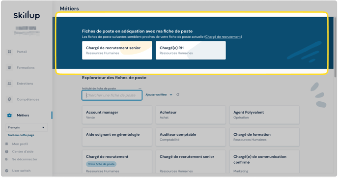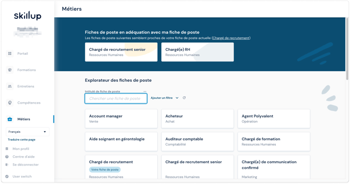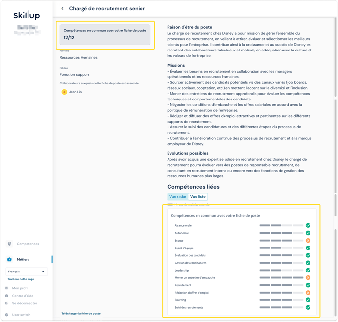 Si vous avez déjà des compétences évaluées dans Skillup, l’onglet Métiers affiche une comparaison directe avec celles du poste sélectionné.