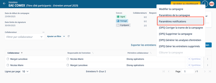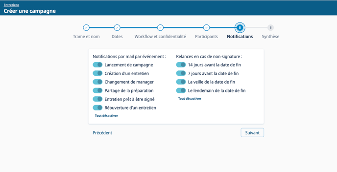 À quoi correspondent les notifications envoyées lors des campagnes d'entretiens et comment les activer ou désactiver au moment de lancer la campagne ou en cours de campagne